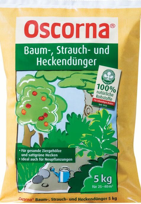 Der Oscorna Baum-, Strauch- und Heckendünger erhöht den natürlichen Humusspiegel im Boden.