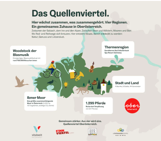 Das Quellenviertel reiht sich nun als neue oberösterreichische Tourismusdestination neben Salzkammergut, Mühlviertel, Donau OÖ, Linz, Region Wels und „Pyhrn-Priel – Bad Hall – Steyr und die Nationalpark Region“ ein.