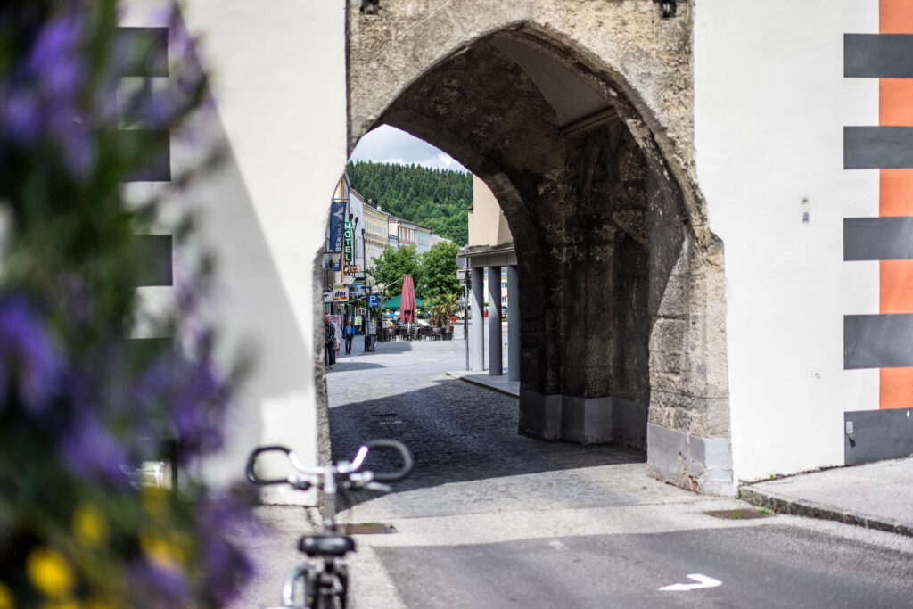 Blick durch ein Vöcklabrucker Stadttor und in die (rosige) Zukunft: wir singen mit den „Talking heads“: „and the future is certain, give us time to work it out..“