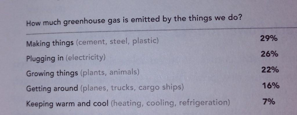 Was ist der Plan für den Zement? Die Erzeugung von Zement, Stahl und Plastik ist für 29% der Emissionen verantwortlich. Das ist Spitze! Die Stromerzeugung trägt 26% bei, Ackerbau und Viehzucht 22%, Verkehr (Flugzeuge, Autos, Frachtschiffe) trägt 16% zu den Emissionen bei, das Heizen bzw. Kühlen unserer Wohnungen + Kühlschränke 7%.