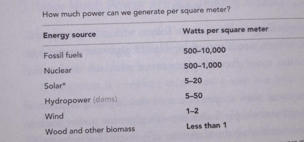 Was ist der Platzbedarf? Das ist eine ganz entscheidende Frage. Wieviel Energie kann man pro Quadratmeter generieren? Mit fossilen Brennstoffen kann man 500-10 000 Watt pro m² produzieren, mit einem Kernkraftwerk 500-1000 Watt pro m². Solaranlagen bringen (derzeit) 5-20 Watt, Windkraft 1-2 Watt pro m². Holz und Biomasse weniger als 1 Watt. Wenn man die gesamte Energie mit Windkraft erzeugen wollte, dann wird es eng auf der Welt!!!