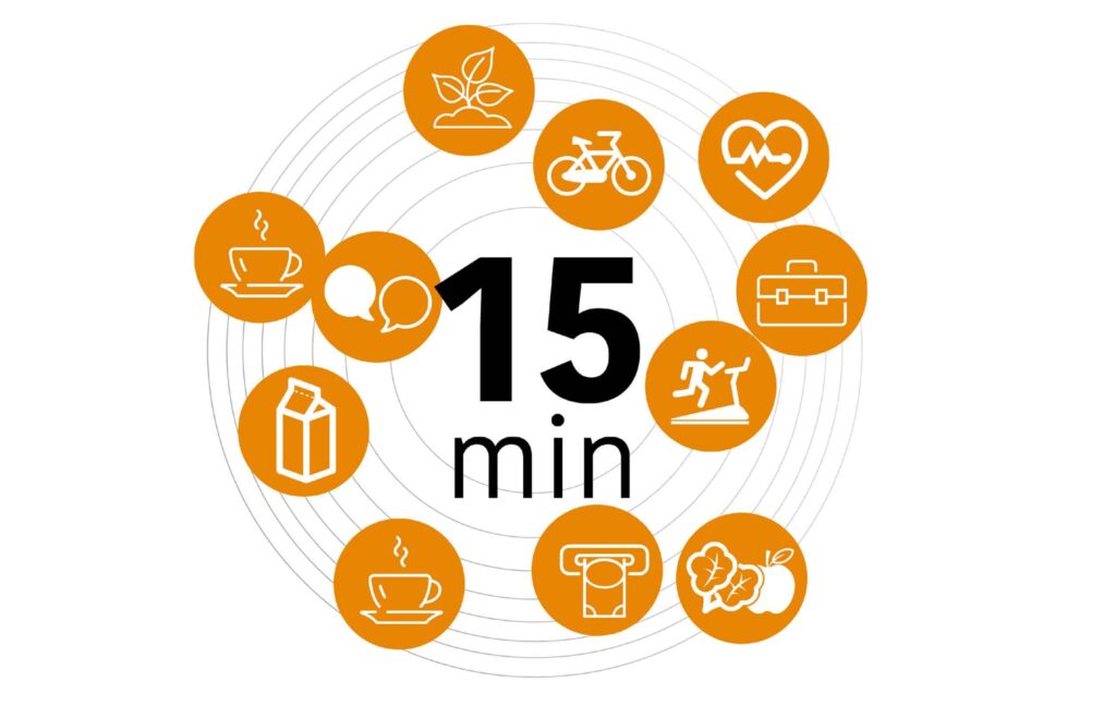 Kern des Konzepts ist, dass Orte, die von den Stadtbewohnern regelmäßig genutzt werden, zu Fuß oder per Rad in maximal 15 Minuten erreichbar sein sollen. Heißt: Zur Arbeit, Schule, zum Arzt oder Einkaufen sollte es vom Wohnhaus nie weiter sein als eine Viertelstunde zu Fuß oder mit dem Rad.